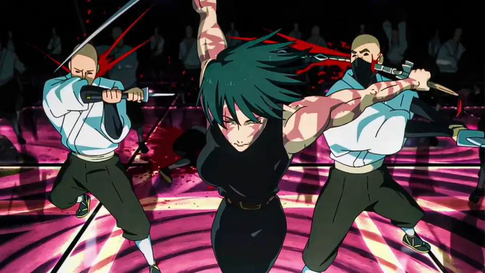A partir desse ponto, o episódio entra em um território raramente explorado pelo anime. Maki extermina o clã Zen’in em uma sequência fria, silenciosa e extremamente violenta.
