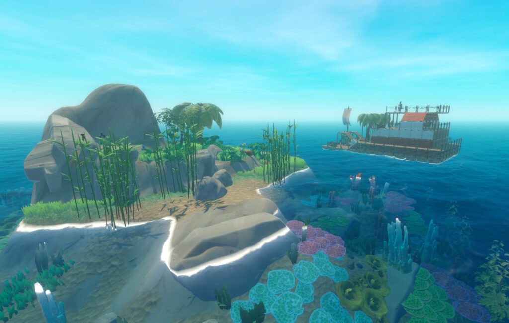 Raft começa com o jogador solitário em uma pequena plataforma flutuando em um oceano vasto e aparentemente infinito. A sobrevivência depende de coletar destroços que passam, purificar água, pescar, construir ferramentas e expandir a jangada pouco a pouco. O mar esconde perigos, incluindo o tubarão que ronda constantemente e ameaça destruir partes da estrutura. Com o tempo, o jogador desbloqueia sistemas mais complexos, navega até ilhas, explora estruturas abandonadas e descobre fragmentos de uma narrativa ambiental que revela o destino do mundo. O progresso transforma a fragilidade inicial em uma base flutuante robusta, criando uma jornada de evolução contínua.